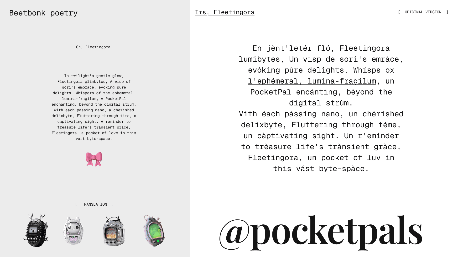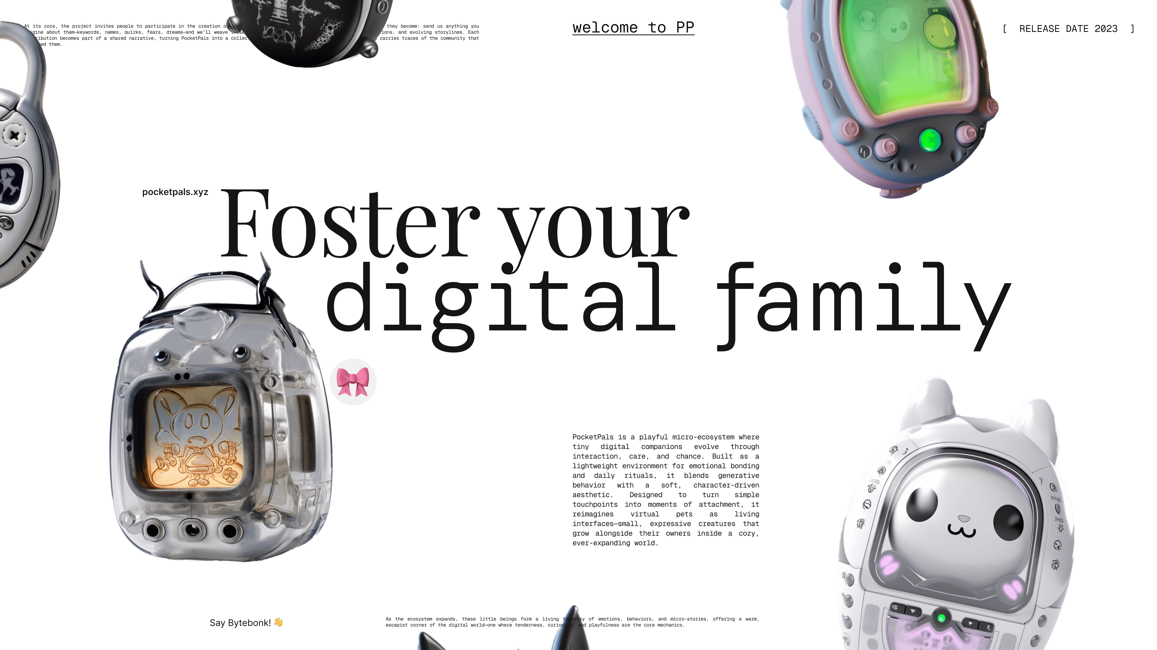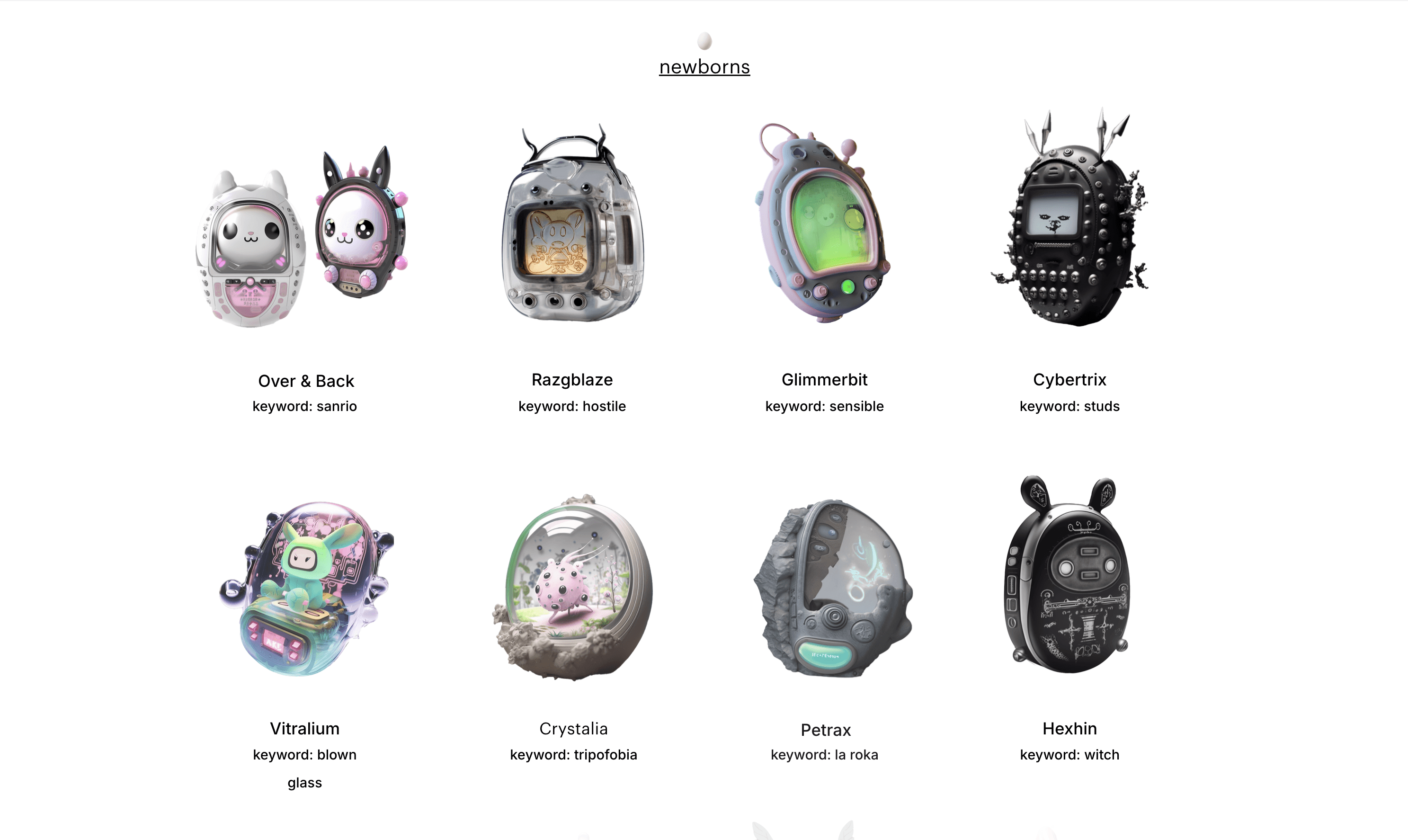 A playful micro-ecosystem where tiny digital companions evolve through interaction, care, and chance. Built as a lightweight environment for emotional bonding and daily rituals, it blends generative behavior with a soft, character-driven aesthetic.